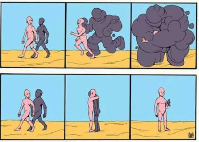 It is said that a picture is worth a thousand words. I came across the illustration above years ago, which captures what I’m trying to describe. Whoever created it certainly understood the therapeutic process through completion. In this six-panel illustration, addictive-compulsive strategies keep people in the second frame. This is preferred because no one wants to experience what takes place in the third frame, and this is exactly what happens if an addiction is given up without deploying another distraction to replace it. But for those who stop one without substituting, if they can learn to fully surrender to what comes in frame three (again, this usually requires help), frames four – six naturally unfold as depicted.